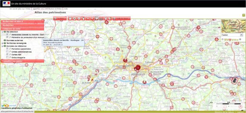 The Atlas is a cartographic access (by location) to cultural and heritage information (ethnographic, archaeological, architectural, urban, landscape). It makes it possible to know, visualize, edit, contract and download geographical data on a territory, including the perimeter of protection of a historical monument.